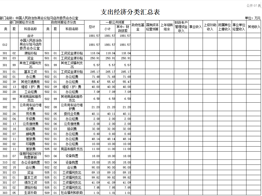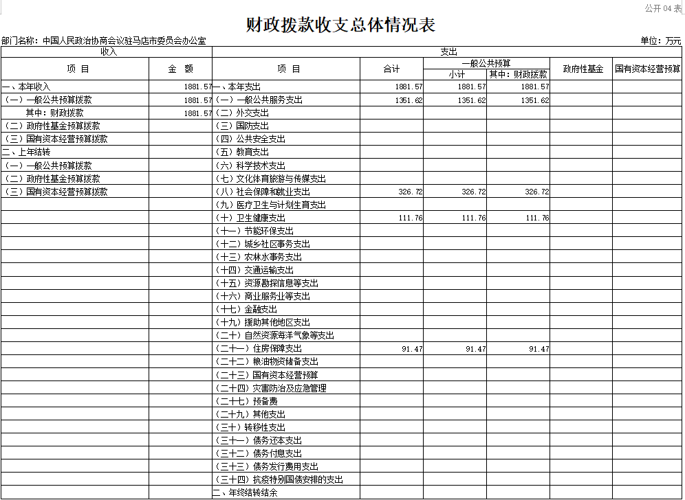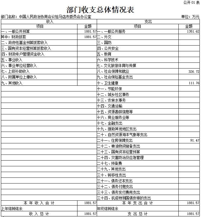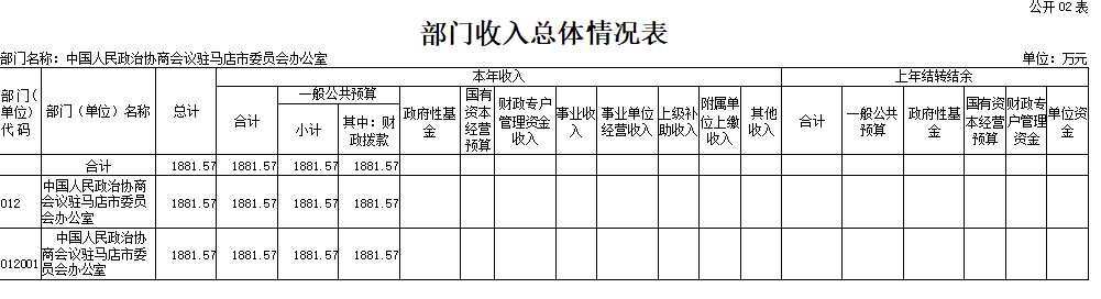 中国人民政治协商会议驻马店市委员会办公室2026年收入合计1881 . 57万元,其中: 一 般公共预算收入1881.57万元。