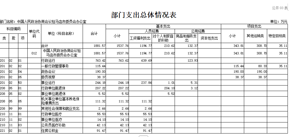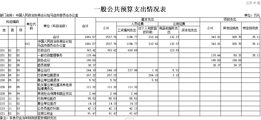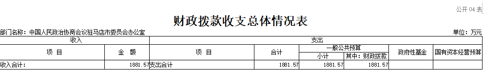 中国人民政治协商会议驻马店市委员会办公室2026年收入合计1881 . 57万元,其中: 一 般公共预算收入1881.57万元。